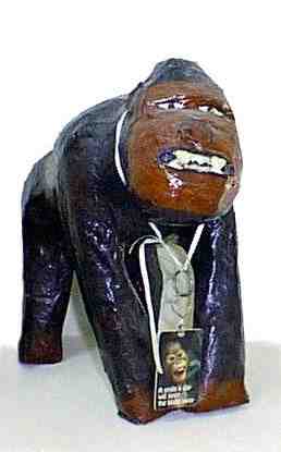 This King Kong was a paper mache gorilla that my husbands brother made him many years ago. I think he used my husband at the model. This guy is the basis of the gorilla collection. He stands proudly overlooking our living room from his perch high atop a landing on the staircase. The necklace with the picture of the chimp was added after I met my husband. |
