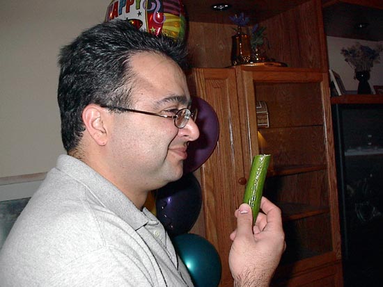 | Jebelli looking at a pint size Iranian cucumber and letting his imiganation run wild. | ![]() |