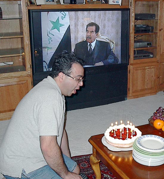 | Jebelli pretending to blow out the candles on a cake, while Sadam (who seems to be smiling) is in the back ground. It is no coinsidence that Jebelli's initials are BJ (Babek Jebelli). | ![]() |