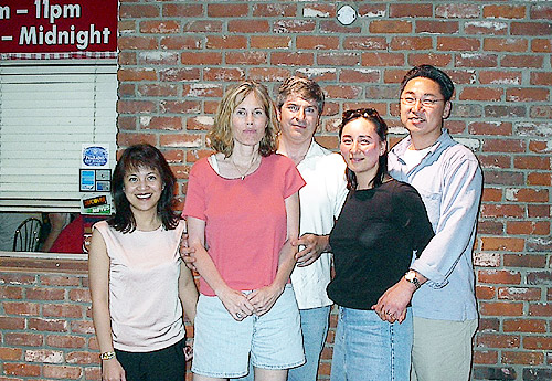 | The group after a filling pizza dinner and drinks for Cathy. I hope the alcholol level went down before she got home to breastfeed. | ![]() |