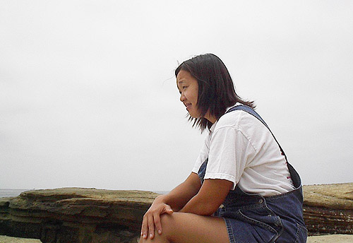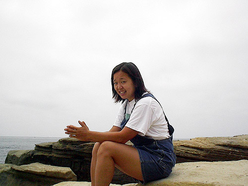 | Angela on some rocks at the beach looking off into the distance | ![]() |