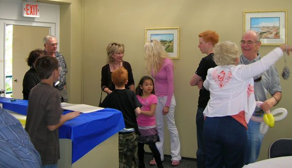 Di came throught the door and we all yelled suprise, and she was. Esp since her brother and sister flew in from out of town for the monumental event. Di in middle with various grand kids, daughters, friends, and ROger getting mauled |